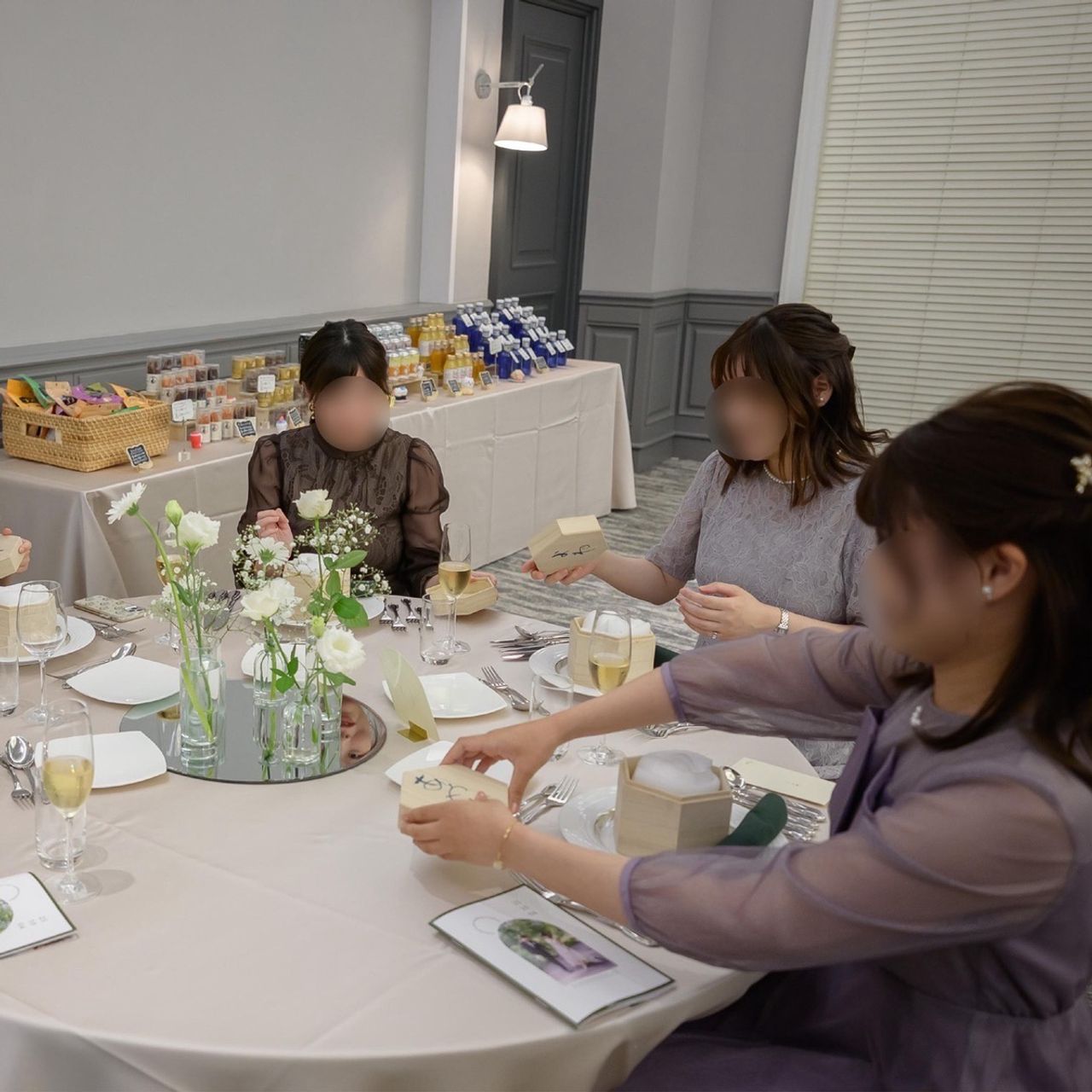 また、披露宴の演出として、合図とともに一斉に木箱を開けるオープンカップセレモニーを取り入れました。ゲスト同士でカップを見せ合ったり、写真を撮ったりしている姿を見ることができ、温かい気持ちになりました。