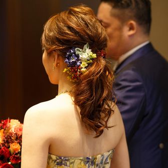 テーマは【ロイヤル×ベースボール】ドレスやヘアスタイルはロイヤルでクラシカルな雰囲気でまとめました。夫が野球好きなので、ケーキトッパーや音楽は夫の好きなチームにちなんだものを使いました!