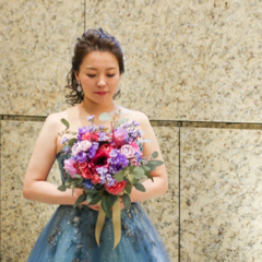 カラードレスと同系色ではなく、対照的な色味で会場装花と揃えたのもこだわりです。最近のアーティフィシャルフラワーは本物みたいだし、花材をまとめながら仕上がりを確認しつつ制作いただける点も満足度が高かったです。
