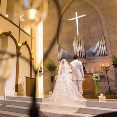 天井が高く開放感と木の温もりを感じられるチャペルです。バージンロードもとっても長く、階段もありロングトレーンのドレスがとっても映えるチャペルでした!
