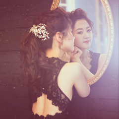 和装でのメイクは、水化粧風になるような艶っぽい、はんなりとした雰囲気にしてもらいました。チークやアイシャドウをピンクでふわっと柔らかに、リップは赤ではっきりとさせ白無垢姿に合うようにリクエストしました。 ヘアスタイルは、お鬘でお式では綿帽子を、披露宴では角隠しに付け替えました。 洋装でのメイクは、お肌はセミマットにし、目を大きく見せたかったのでブラウンのアイシャドウに変え、アイラインを長めに引いてもらいました。リップはグロスでつやつやにしてもらいました。デコルテや腕、背中には細かいラメを付けてもらい高砂のライトでキラキラになるようにリクエストしました。 ヘアスタイルは、憧れのローマの休日 アン王女のようなスッキリとしたまとめ髪でティアラが栄えるスタイルにしてもらいました。