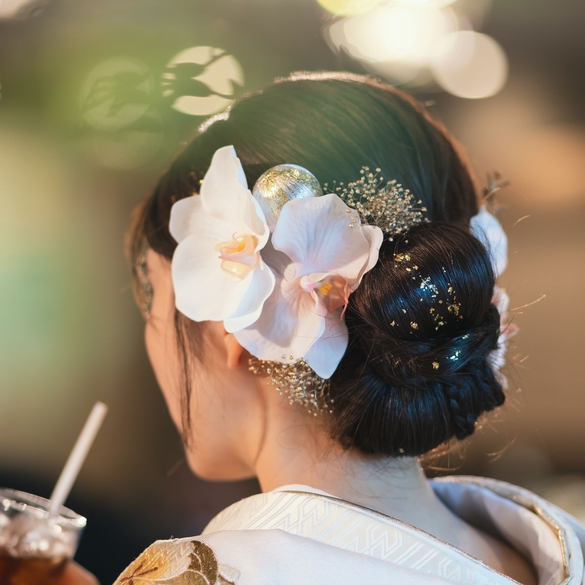 色打掛は衣装の色に合わせて、ホワイトやピンクの胡蝶蘭に金箔やゴールドの飾りでまとめました。
