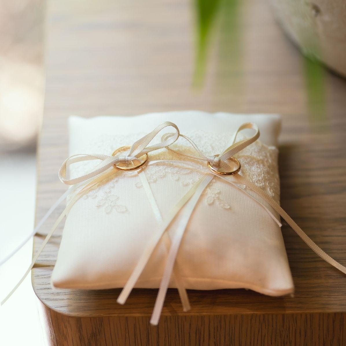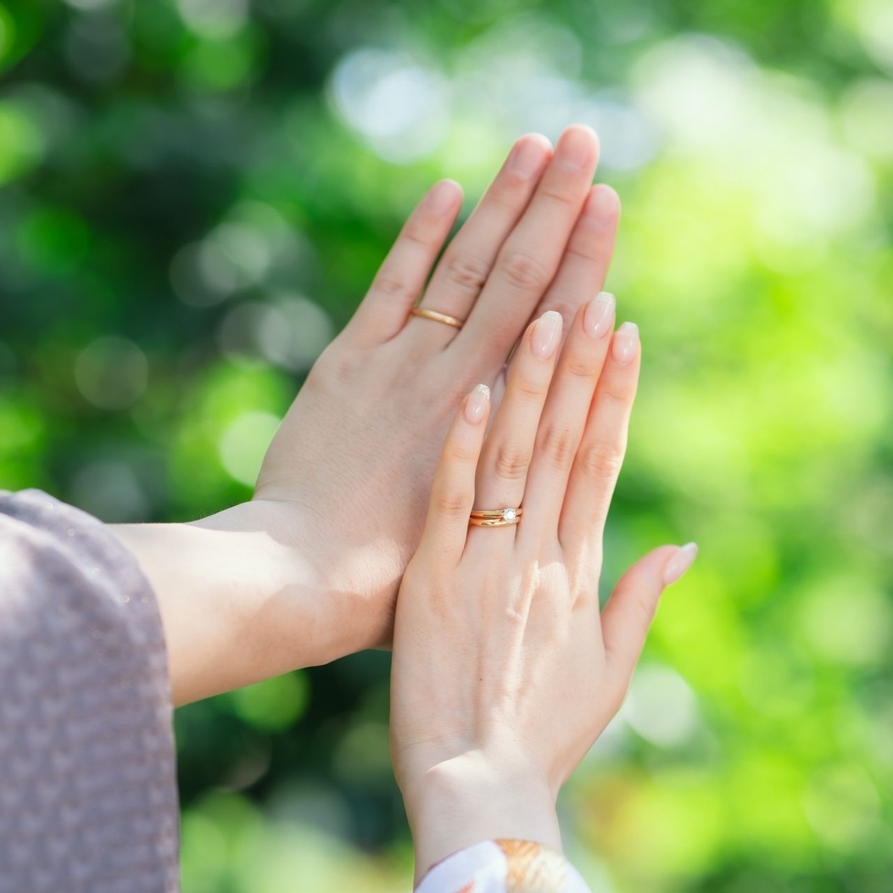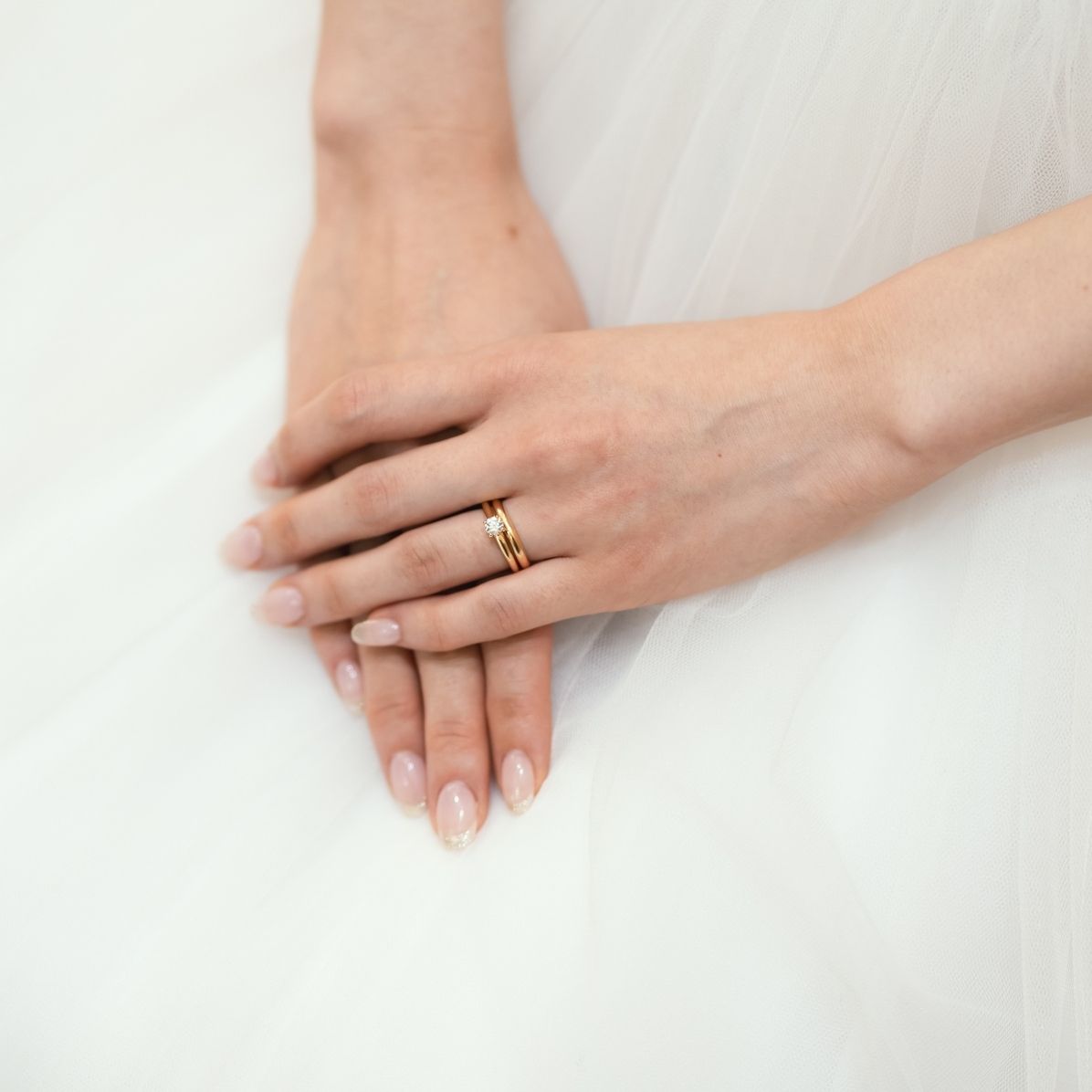 婚約指輪と重ね着けしても合うように、ゴールドのシンプルなデザインにしました。