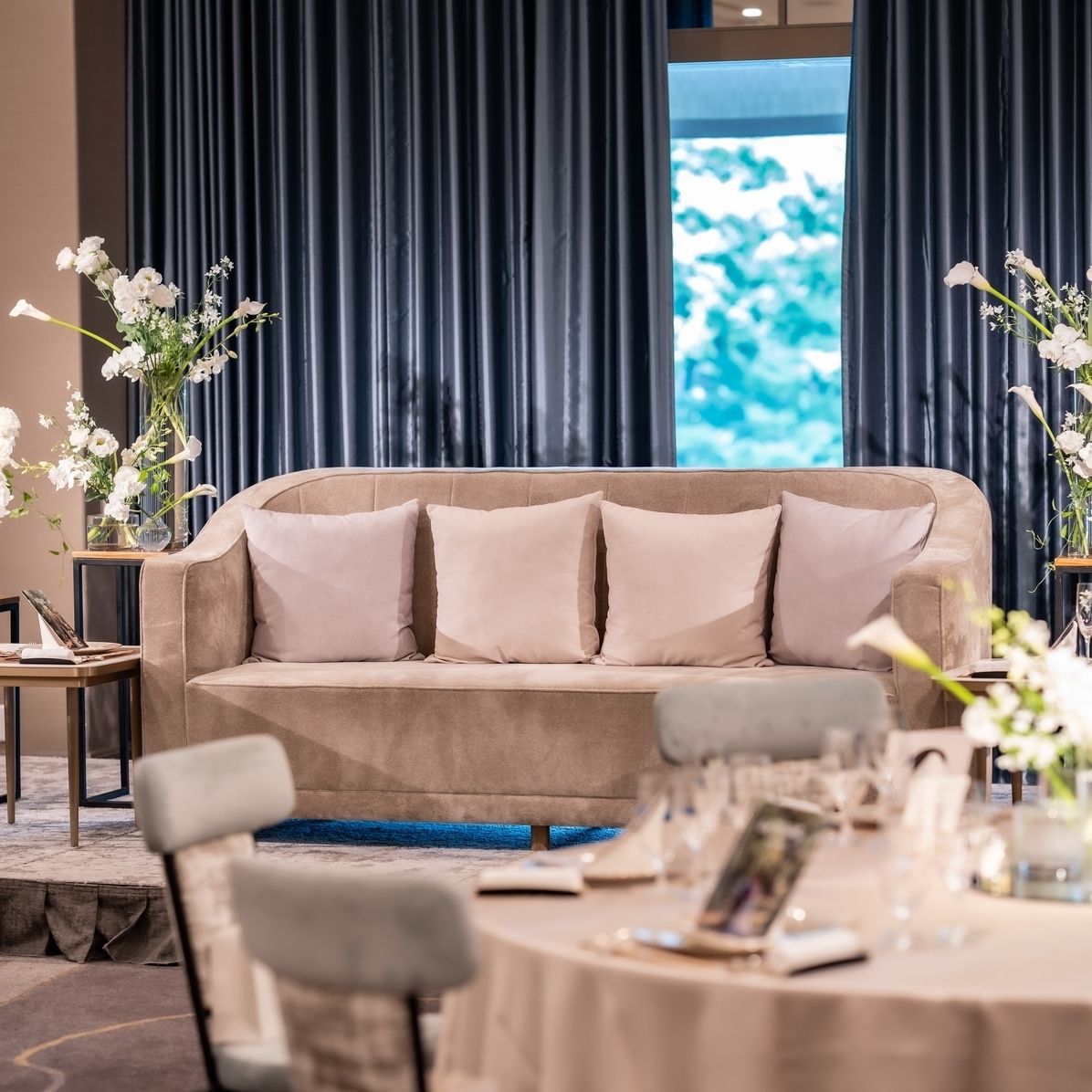 カーテンはブルーでソファは明るいグレーなので、装花で雰囲気を変えられるところも嬉しいポイントです✨