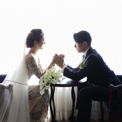 一人で来てくれるゲストが高砂に来やすいように、二人の思い出写真を詰めたメモリアルトランクやフォトプロップスを置いたテーブルを高砂近くに配置しました♡