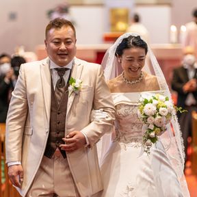 とても長いバージンロードとステンドグラスが創り出す厳粛な教会挙式。素敵な雰囲気の中、写真をたくさん残す事ができました。ブーケは姉のお手製でドレスに合わせて素敵な私好みのブーケに仕上げてくれました。