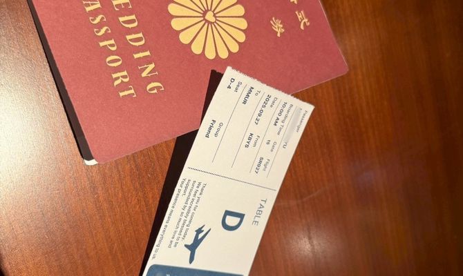 受付ではウェディングパスポートをお渡しし、エスコートカードは航空券をイメージしたデザインに仕上げました。