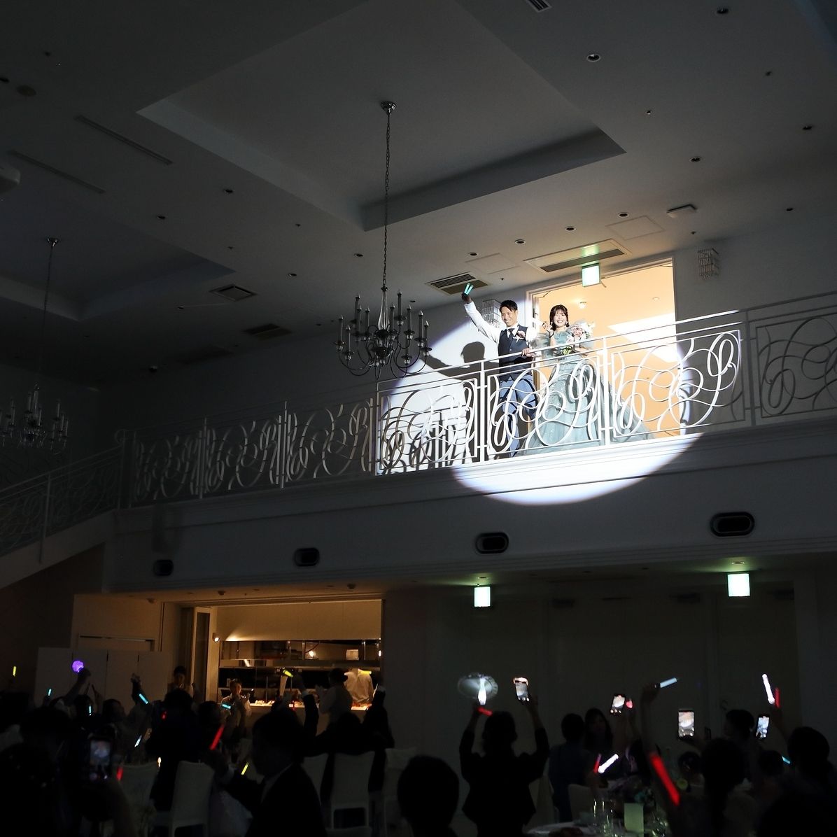 推しがいる友人には自前のペンライトを持参してもらい、よりライブ感のある雰囲気にしました。階段からの再入場は、まるでライブ会場のような盛り上がりになりました。