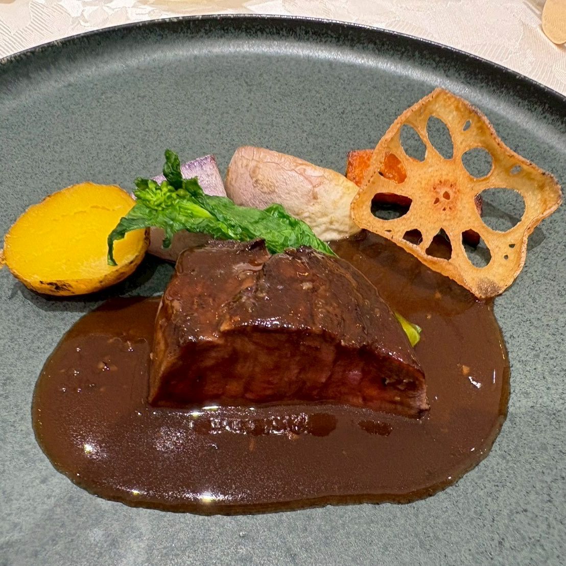 さらにメインのお肉料理は、シェフがゲストの目の前でソースをかける演出付きにしています。