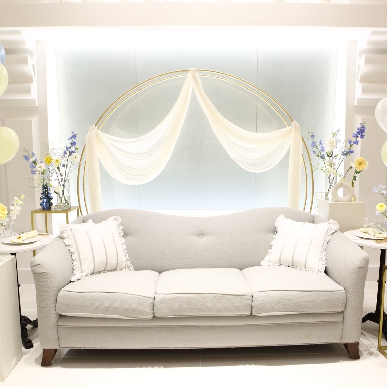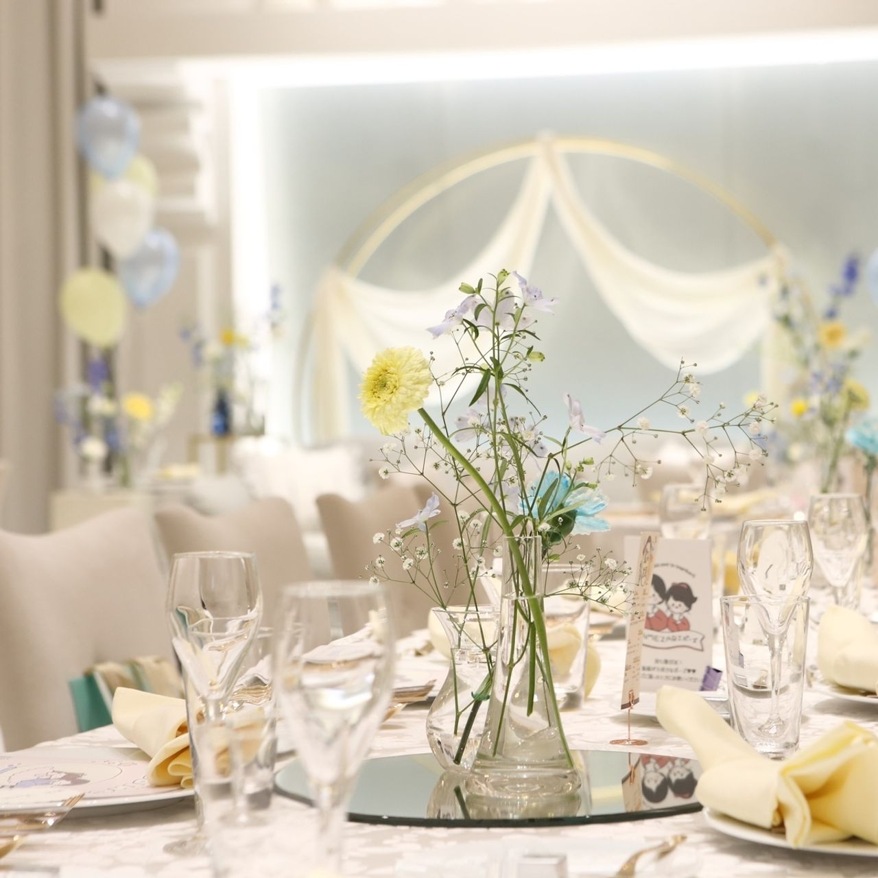 青、黄色、白を中心に使い透明感を出してもらっています。遊び心も入れたかったので、パステルカラーのバルーンも置いていただき、最後はお子様ゲストにプレゼントしました