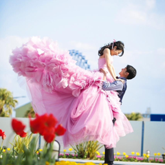 可愛すぎないペタルピンクにふわっふわの花びら、腰のリボンでウエストもきゅっと見えて、マイナスポイントのないドンピシャなドレスでした。