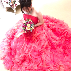 ウェディングドレスがハートカットでしたので、前からみた見た印象が変わる様にストレートカットの物にしました。現在流行はくすみ系などですが、昔から好きなピンクや角度によっては赤のようにも見え、はっきりとした色のドレスにしました。カラードレスを探すにあたり、フェアブルーム内のフィオーレビアンカの担当の方には、何度も他店から希望に近いものを取り寄せて頂いたり、髪型やアクセサリーについても相談に乗って頂き、大変お世話になりました。