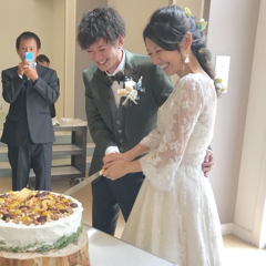 ケーキの土台を本物の丸太の切れ端にしたことです。新郎新婦共に顔面生クリームの演出をしました!