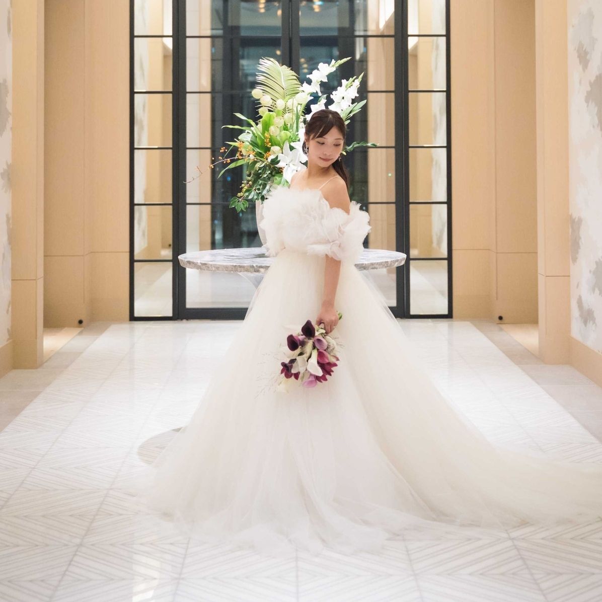 1着目がスタイリッシュで構築的なシルエットだったのに対し、Nanaはふわふわで可愛い、柔らかさたっぷりのシルエット。同じ白でも雰囲気がまったく違うため、1日で2つのまったく違う花嫁像を楽しめるところが決め手でした。