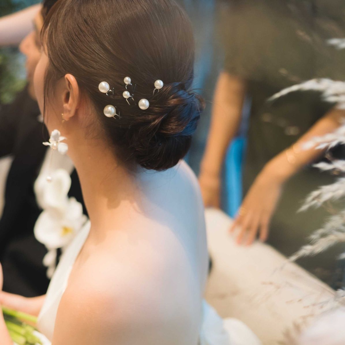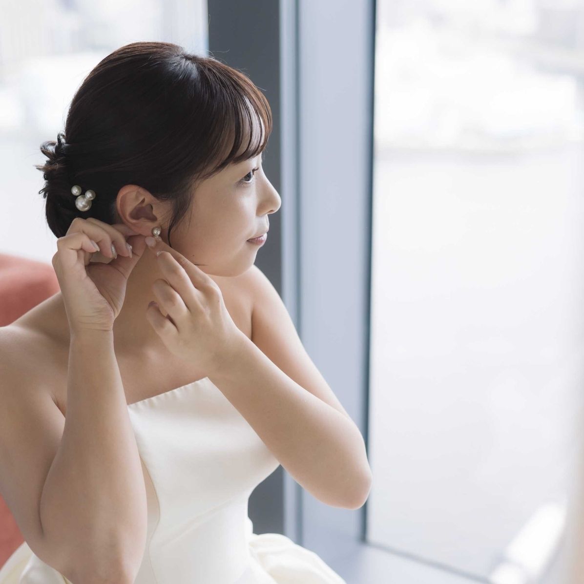 Elizabeth BowerのPearl Dublet Studを着用しました。上品でクラシックな印象になり、チャペルとの相性もぴったりでした。