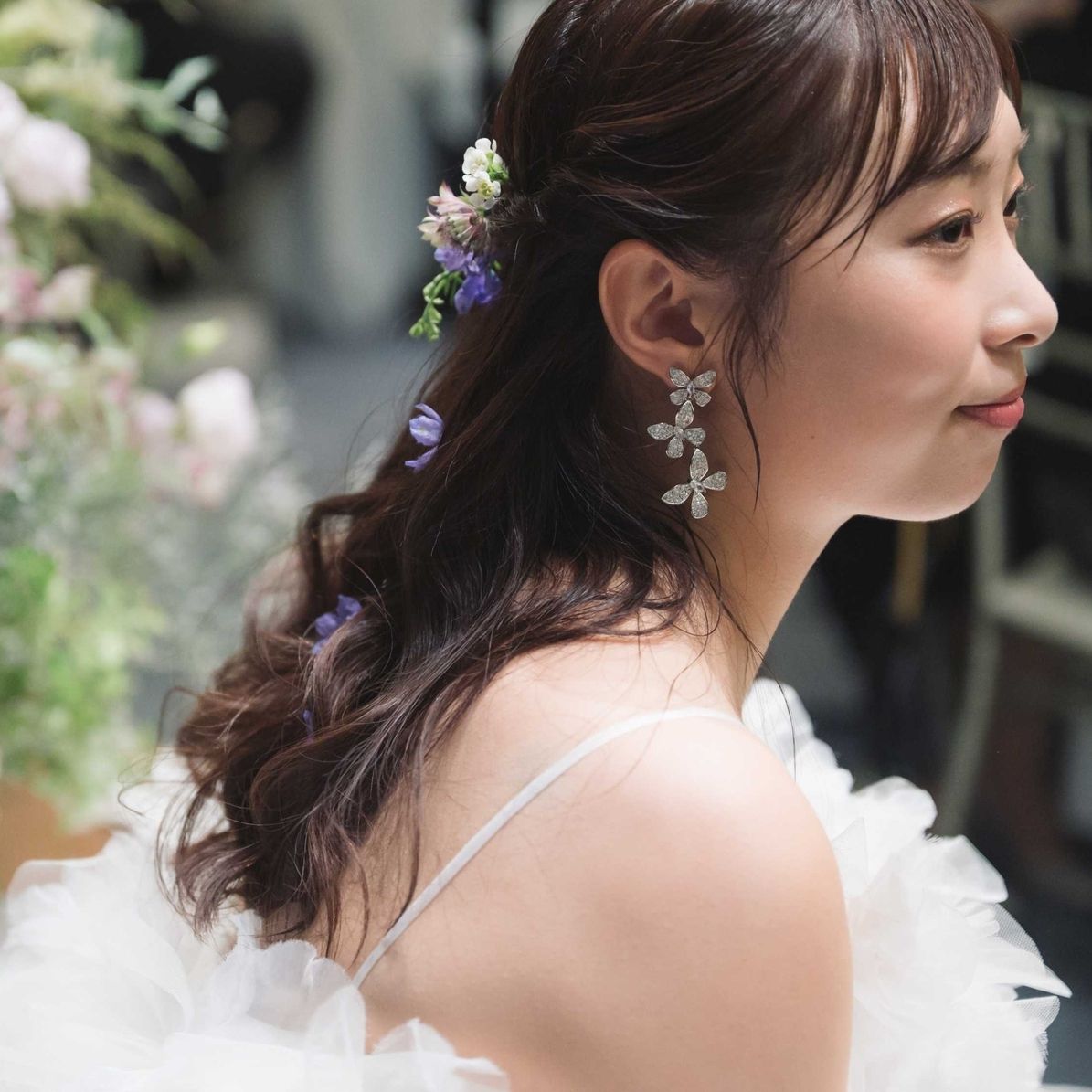 2着目では一転して、ふわふわのハーフツイン × 生花 でガラッとイメージチェンジ。可愛らしいドレスの雰囲気に合わせて、気分はまさにラプンツェルでした!笑
