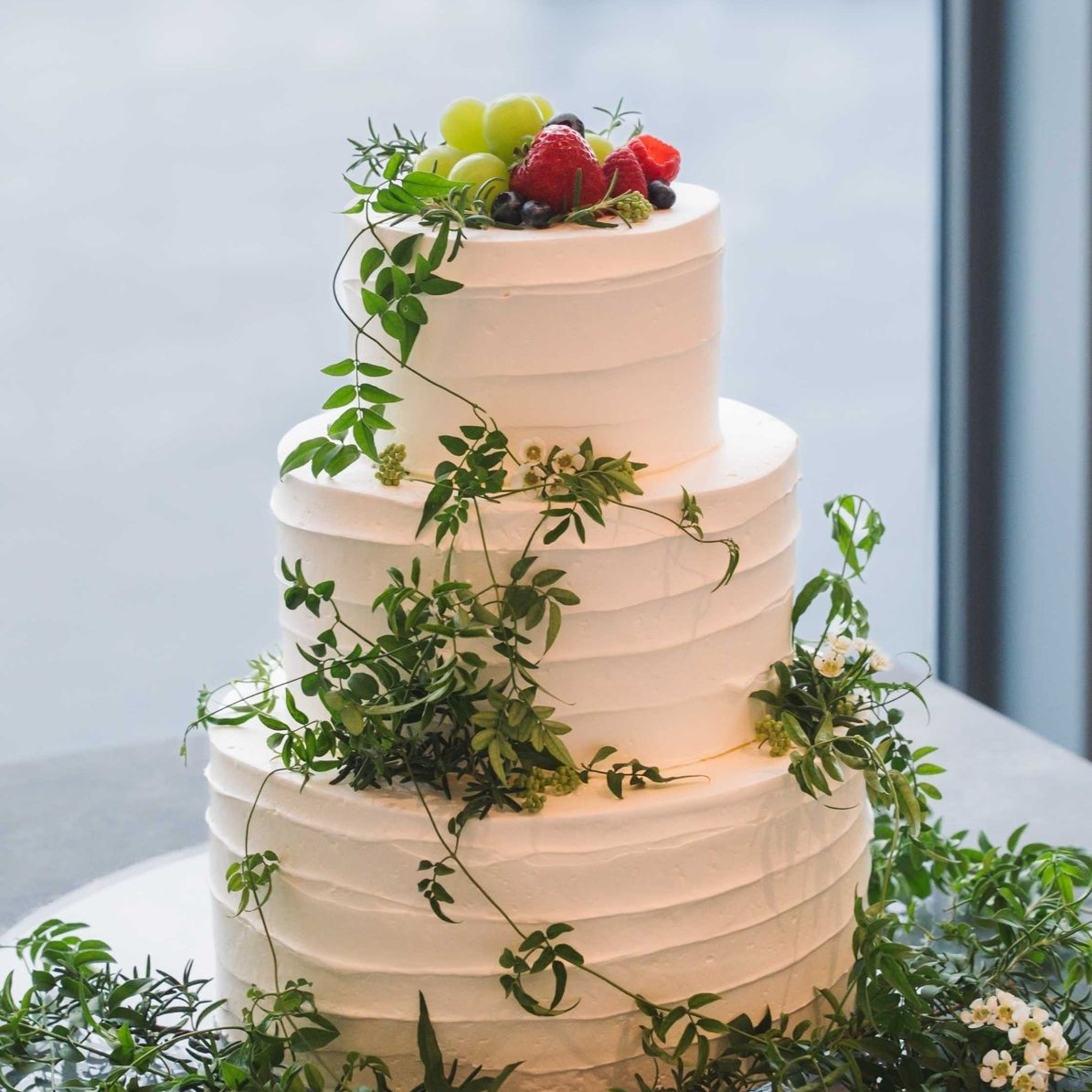 さらに、会場の景色やコーディネートと馴染むよう、グリーンをたっぷりと入れてナチュラル感をプラスしました。海と空が広がるフェアモント東京らしい爽やかな雰囲気とも相性が良く、写真映えも抜群でした。シンプルだけど存在感のある、私たちらしいケーキになったと思います。