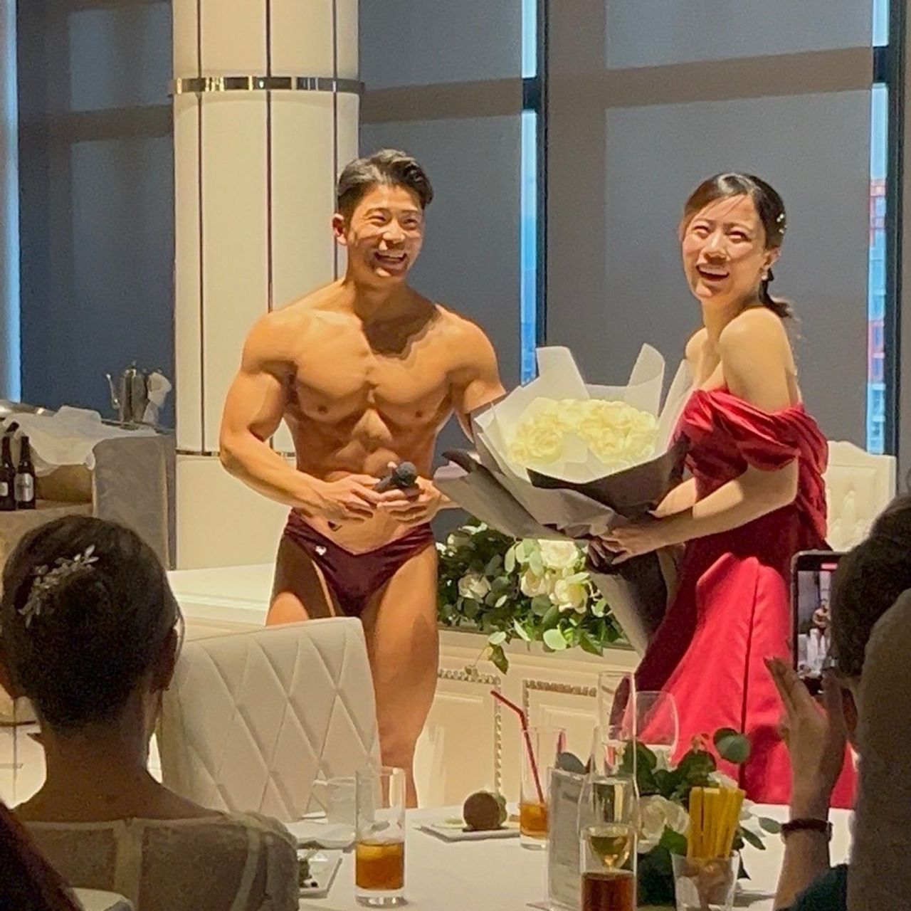 夫はボディビルダーなのですが、ボディビルの余興の後に、ひとりでポーズを披露してくれて、花束を渡してくれました。その気持ちに感動して涙が止まりませんでした。