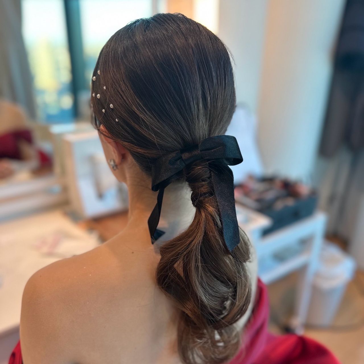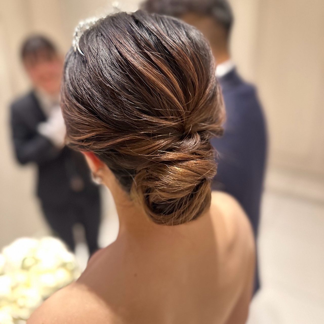 マーメイドドレスだったので、背中がきれいに見えるよう、ヘアは思いきってガッツリとアップスタイルにしました。