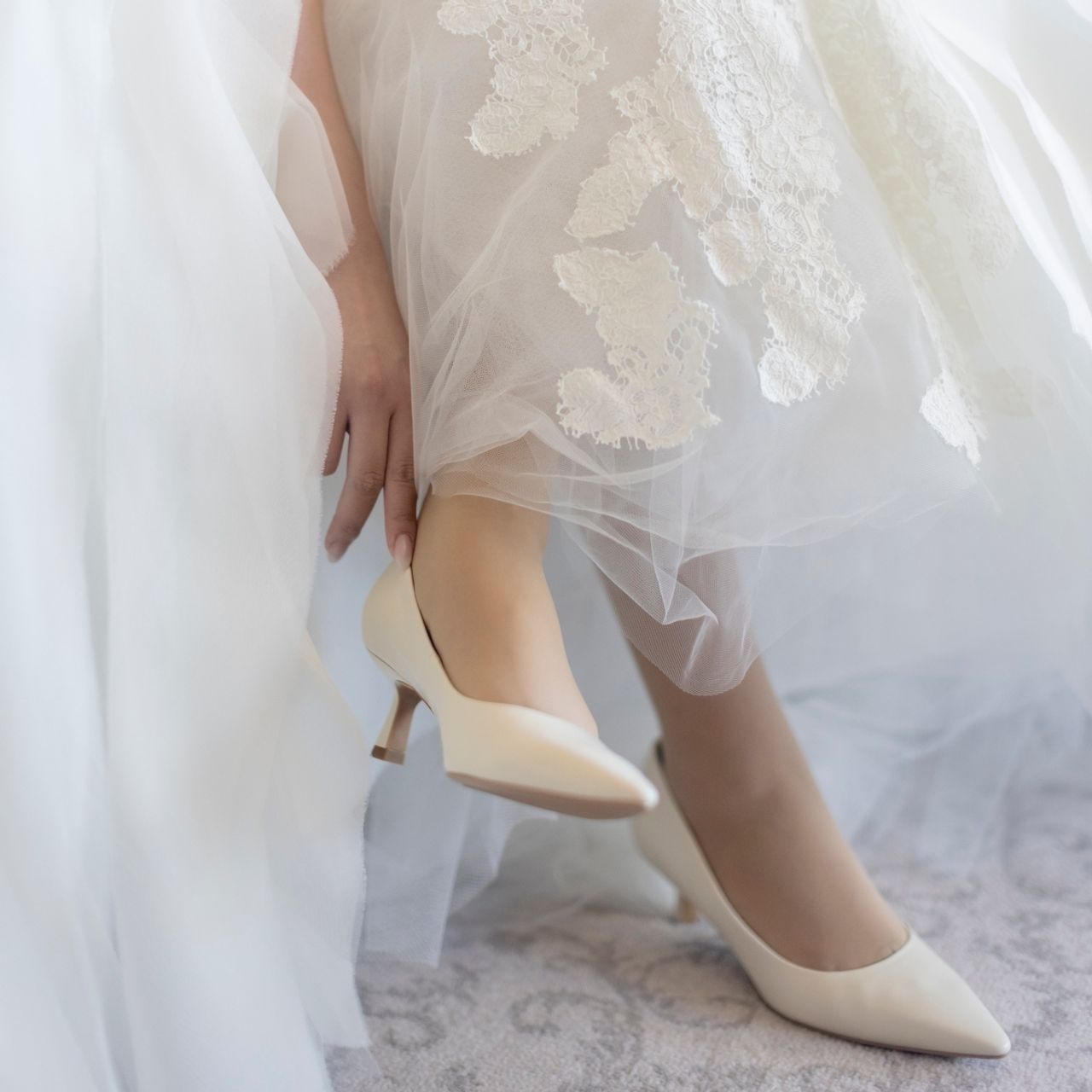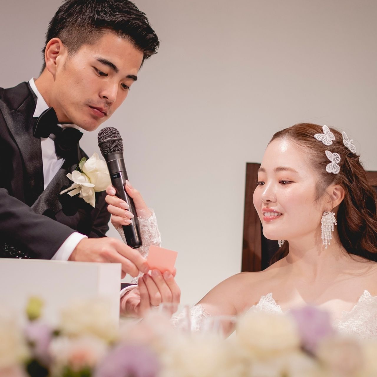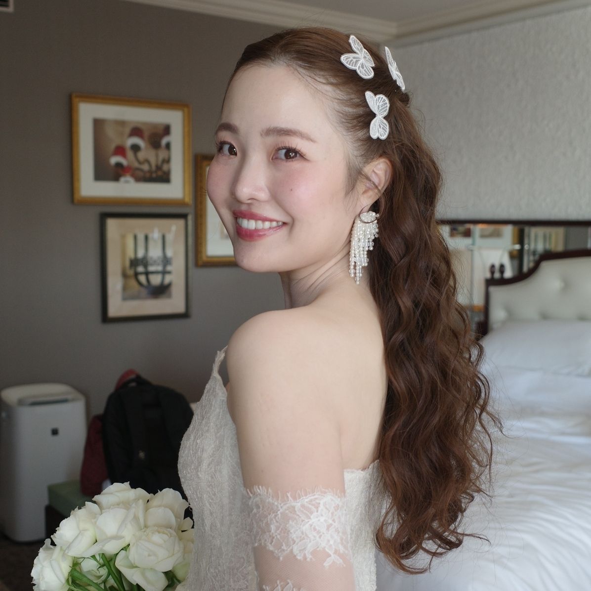 お色直しでは、ドレスがレースとチュールのものだったので、優しい雰囲気の蝶のヘアピンを探し、同じ素材のもので揃えました。
