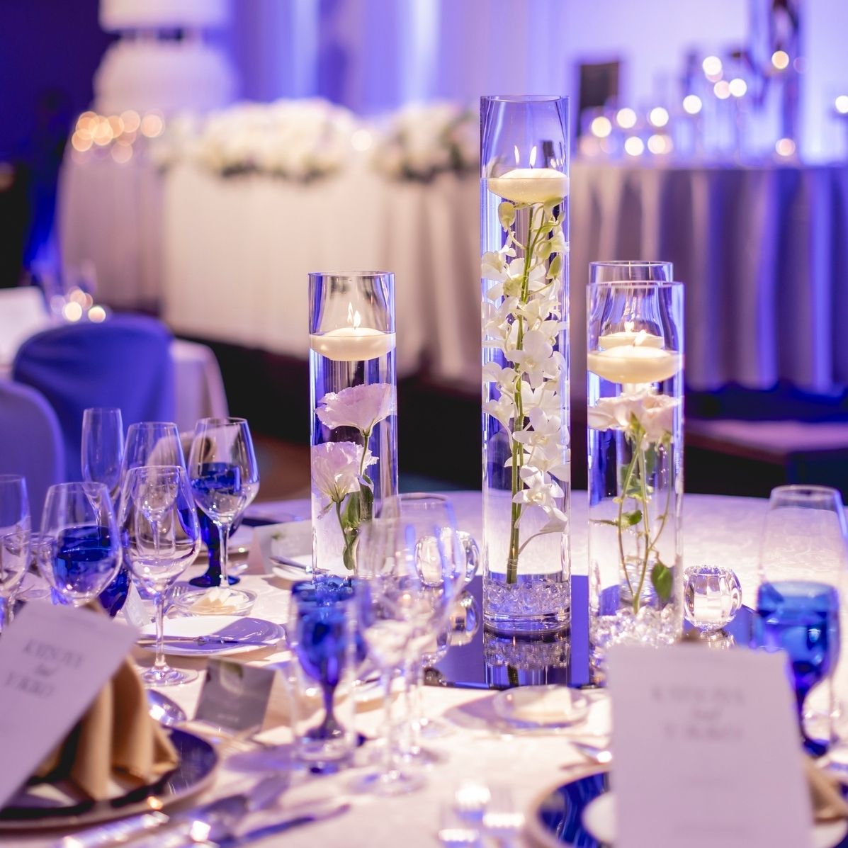 会場全体を淡いトーンでまとめて、キャンドルもたっぷり使い、暗転した時にも会場の表情が変わるようにしました。キラキラしていてとても幻想的で、燭台を聖餐テーブルに入れたことにより、キャンドルの高低差で動きが出ました。