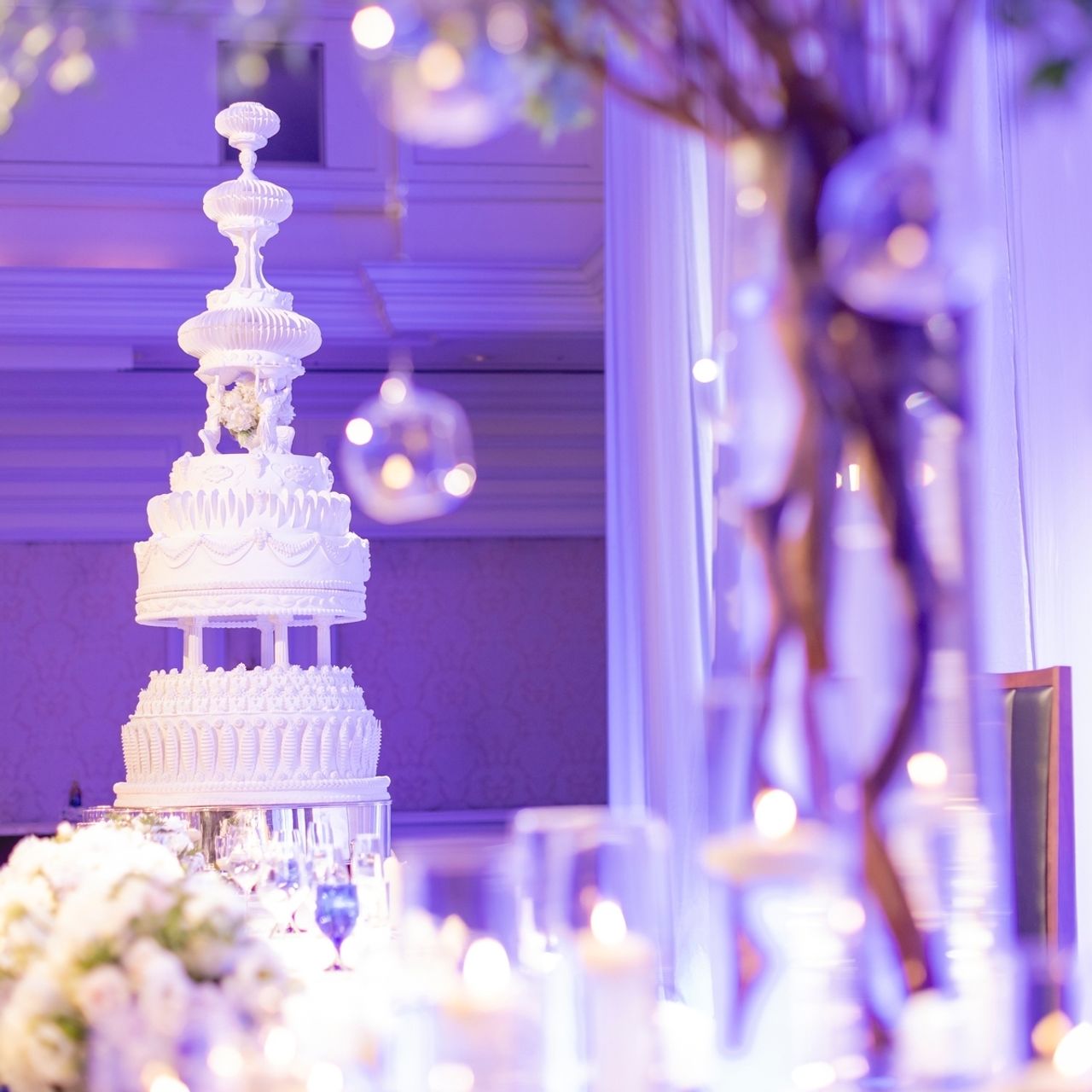また、ウェディングケーキがとても存在感のある高さなので、バランスを取るために高砂右側にツリーを入れています。