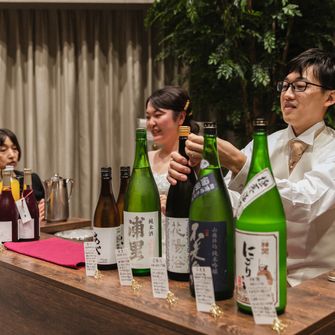 挙式は人前式で、熟成用のお酒を結婚証明書に見立てた日本酒ボックスセレモニー、披露宴では二人でセレクトした日本酒とジュースでバーを開いてゲストへサーブしています。