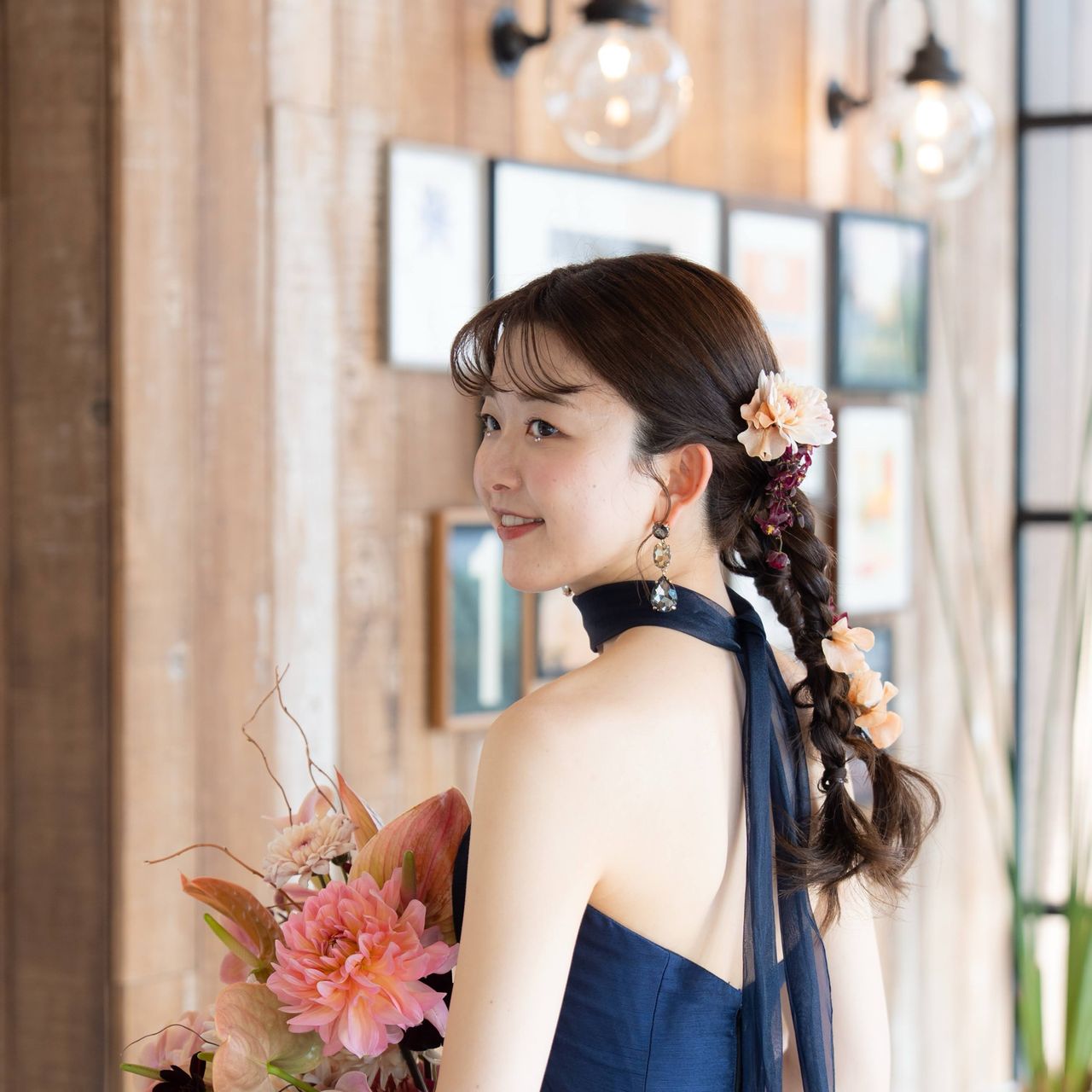 披露宴では挙式のアクセサリーをフルチェンジし、細リボンとお花のピアス