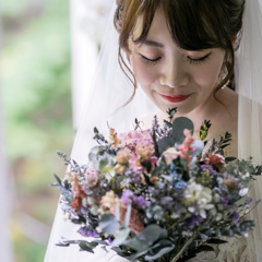 ウェディングドレスは、くすみカラーでまとめ、