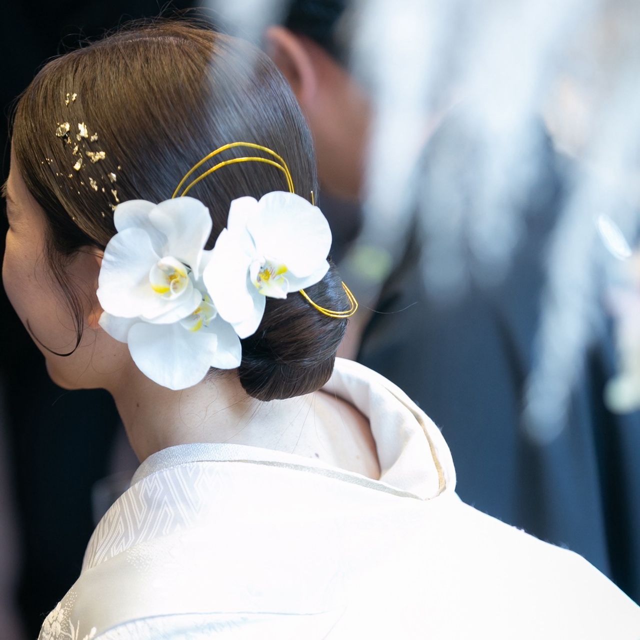 披露宴:シニヨン+生花(胡蝶蘭)、水引、金箔
