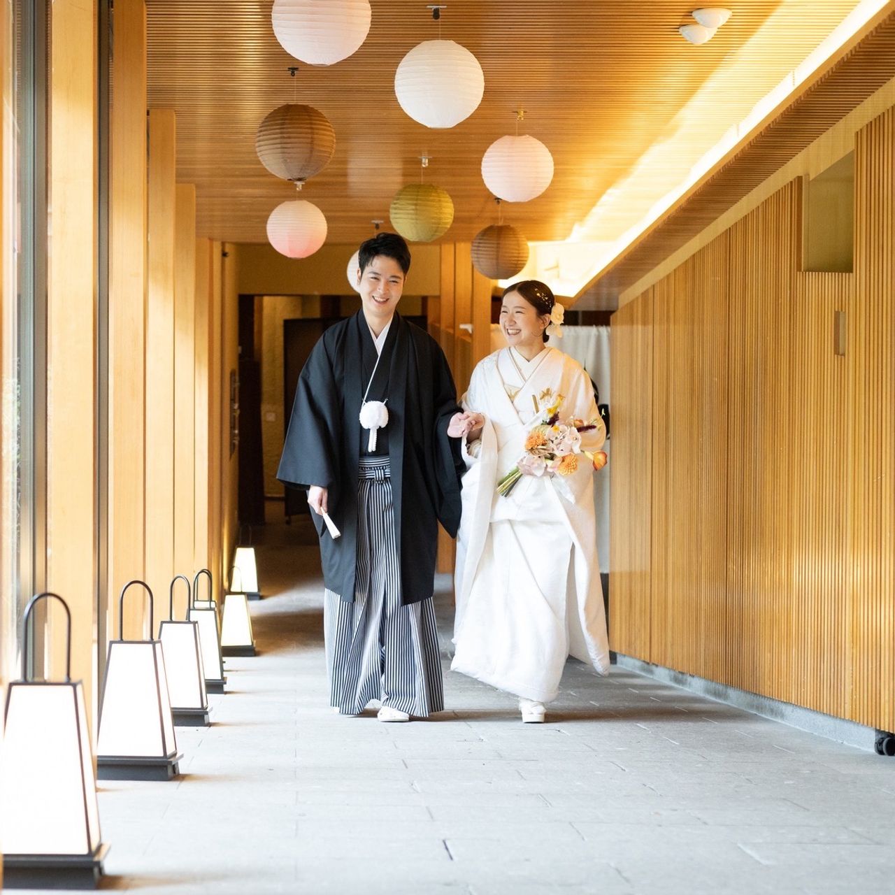 挙式では綿帽子を被り、披露宴では生花、水引、金箔のアレンジを楽しめました。