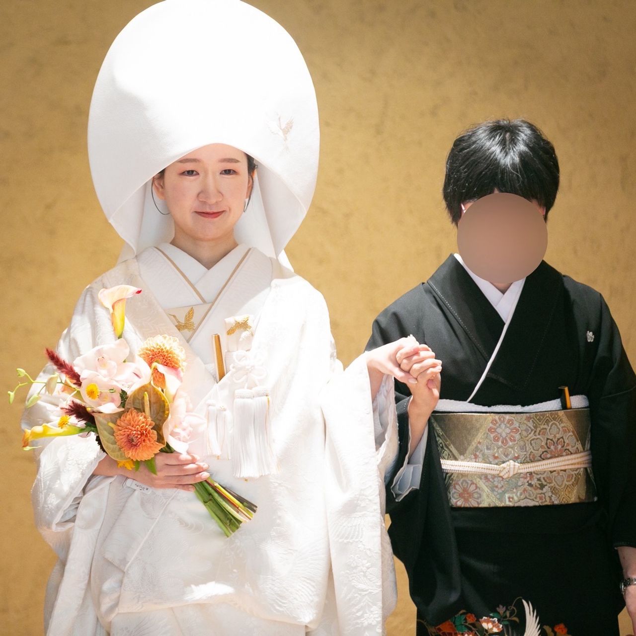 シンプルな白無垢を選んだので、襟や小物類をゴールドでまとめて定番ながらも華やかさをプラスしました。顔色がパッと明るく見える絶妙な白色が決め手でした!
