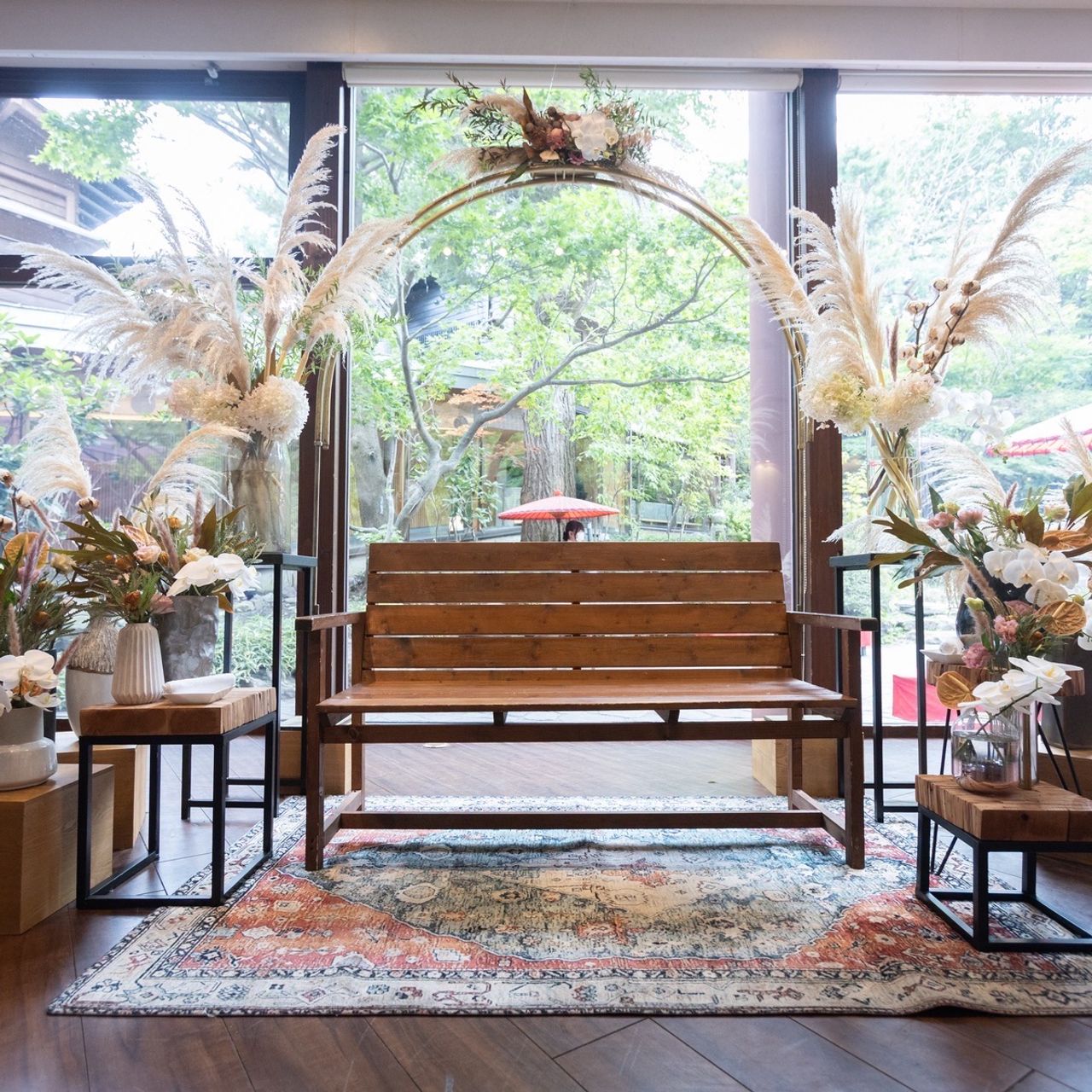 新郎新婦の椅子をベンチタイプにして、後ろにアーチ状のお花を飾っています。高砂でゲストと写真を撮る時にとても映えました!