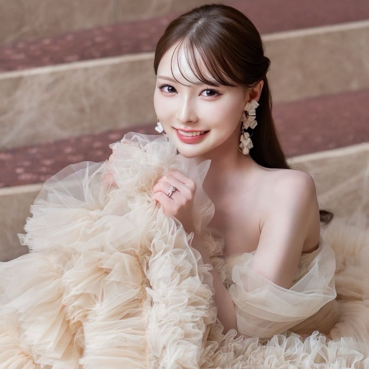 ベージュという落ち着いたカラーのおかげか、どこか大人っぽさもあります。フェミニンで華やかでそして柔らかい雰囲気に一目惚れしました。