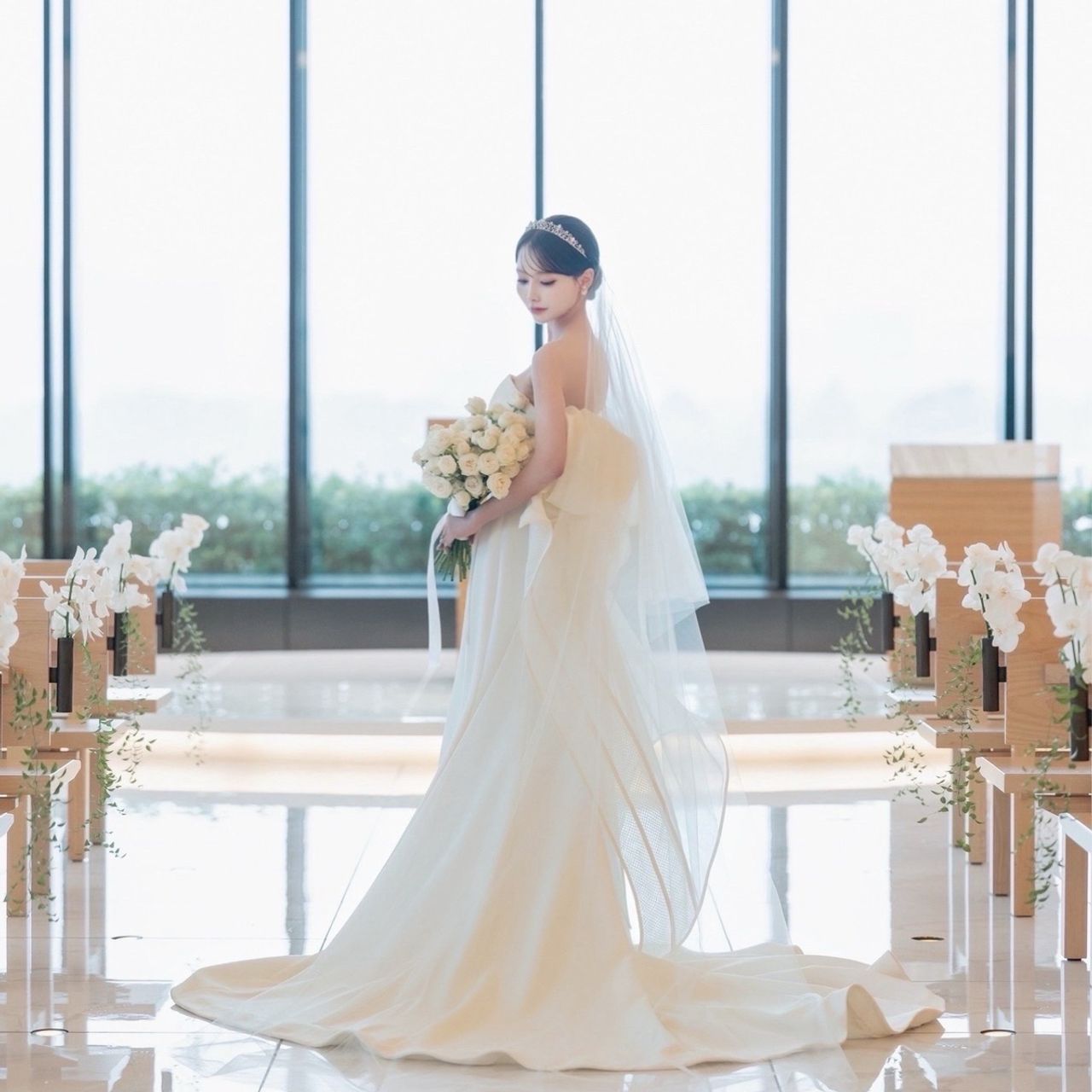 長く広いバージンロードに続く大きな窓から見える皇居、開放感のある高い天井、新郎新婦が反射する美しい大理石の床、木の温もりがポイントです。