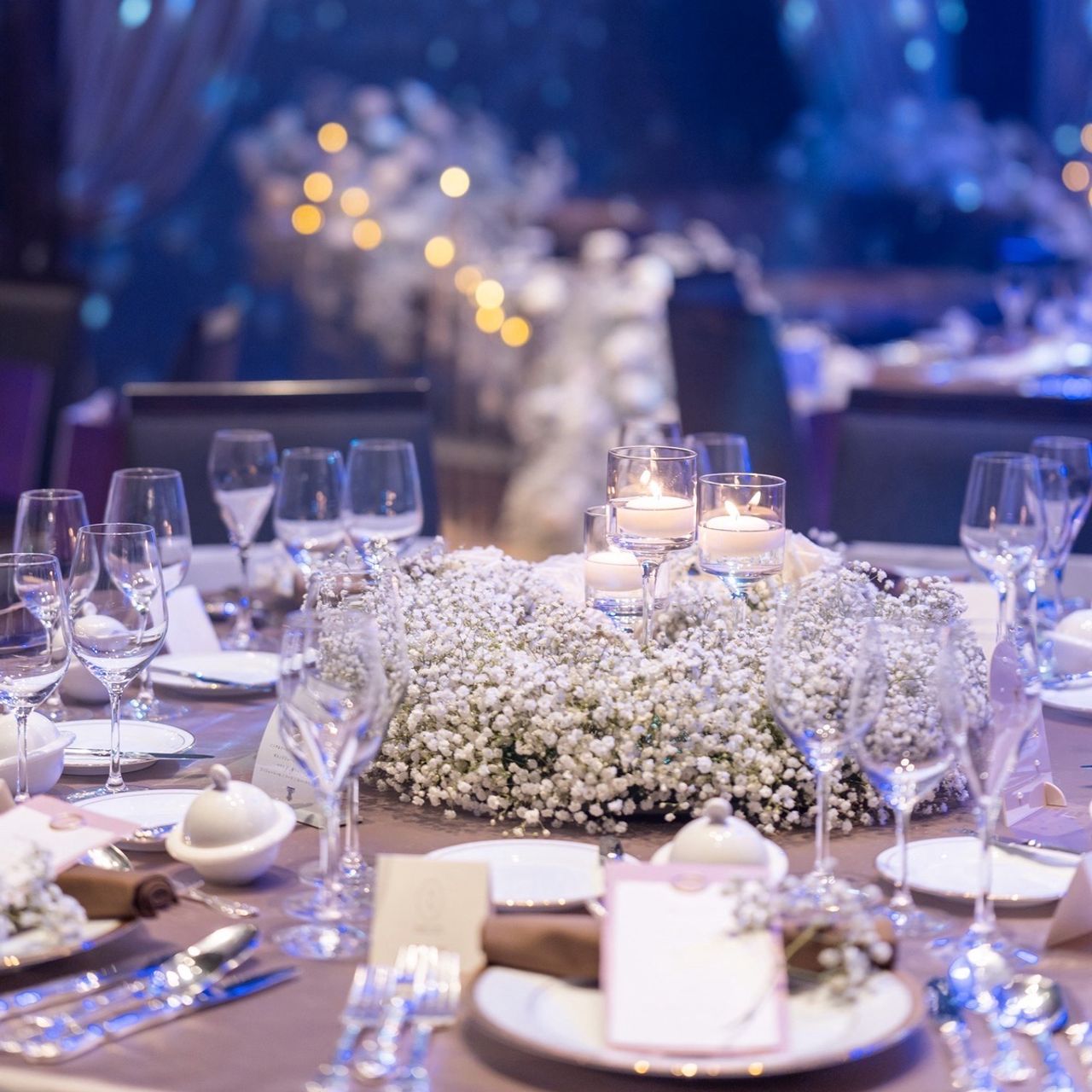 ゲストのテーブルは3パターンで、飾り皿にもペーパーアイテムと共に全員に1つ1つかすみ草を置いてもらいました。