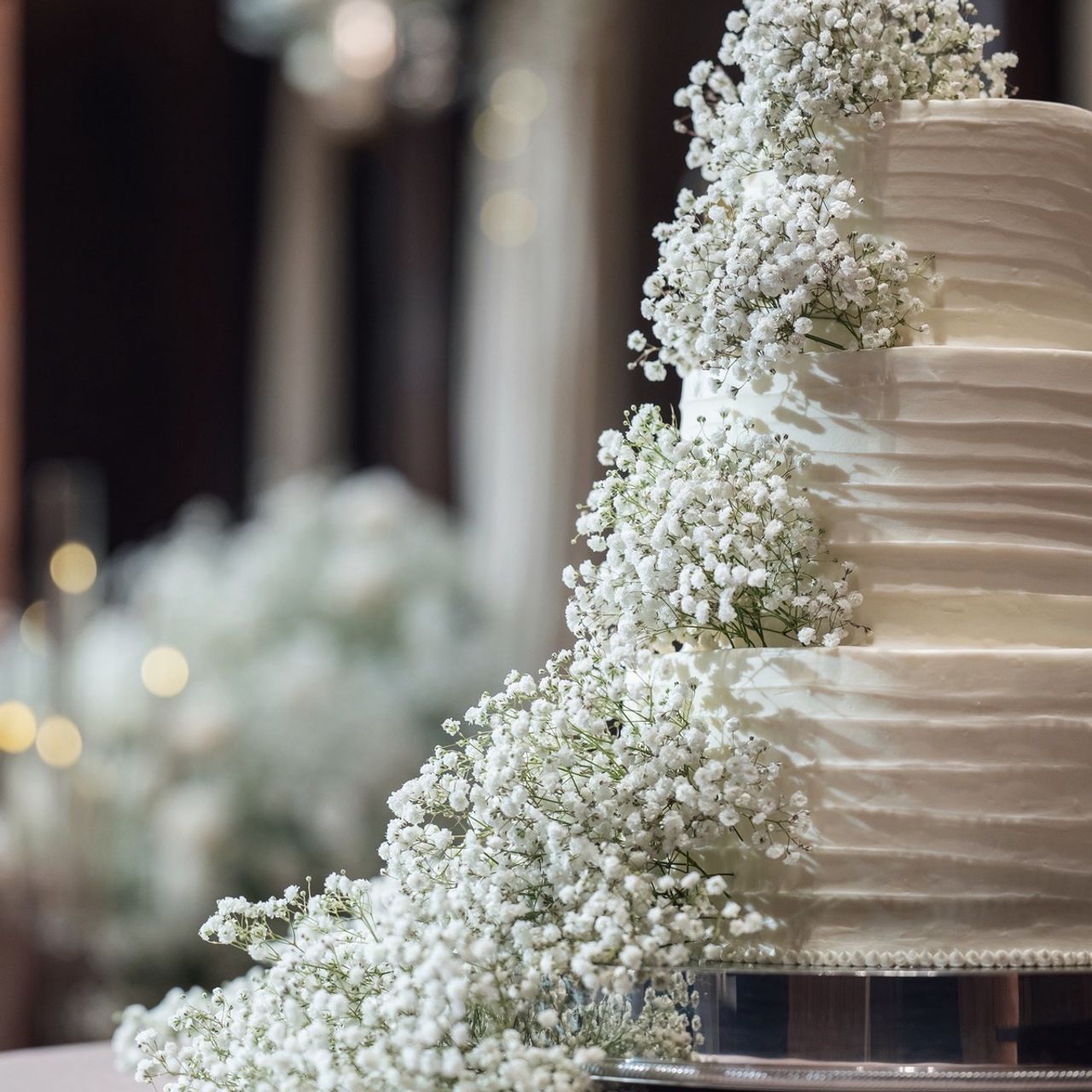 ナチュラルなウェディングケーキにしたく、会場装花とイメージを合わせてかすみ草をふんだんに使用しました。
