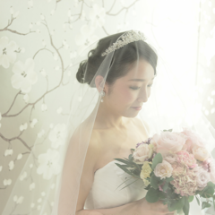 挙式ではティアラを、披露宴では葉っぱモチーフの大振りヘッドアクセサリーを、お色直し後は少し可愛らしくホワイトのお花のヘッドにブーケと同じ色味の生花を合わせてつけてもらいました。