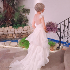 大人っぽい刺繍とチュールのバランスがとても可愛いかったです。ウェディングドレスを長時間着ていたかったのでお色直しは無しでした。