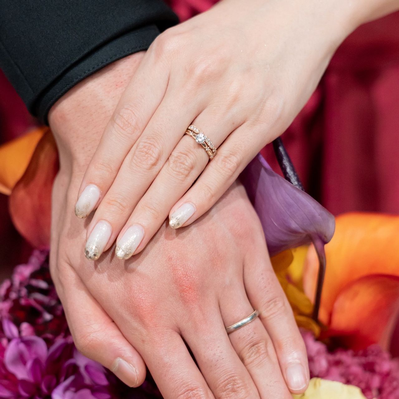 いろいろなお店を見て回る中で、私だけではなく旦那さんにもよく似合っていたことが決め手になりました。私はゴールド系を希望していて、旦那さんはシルバーがいいとのことだったため、それぞれの好みを大切にしながらも、ペア感が出るようにミル打ち部分の色をそろえています。