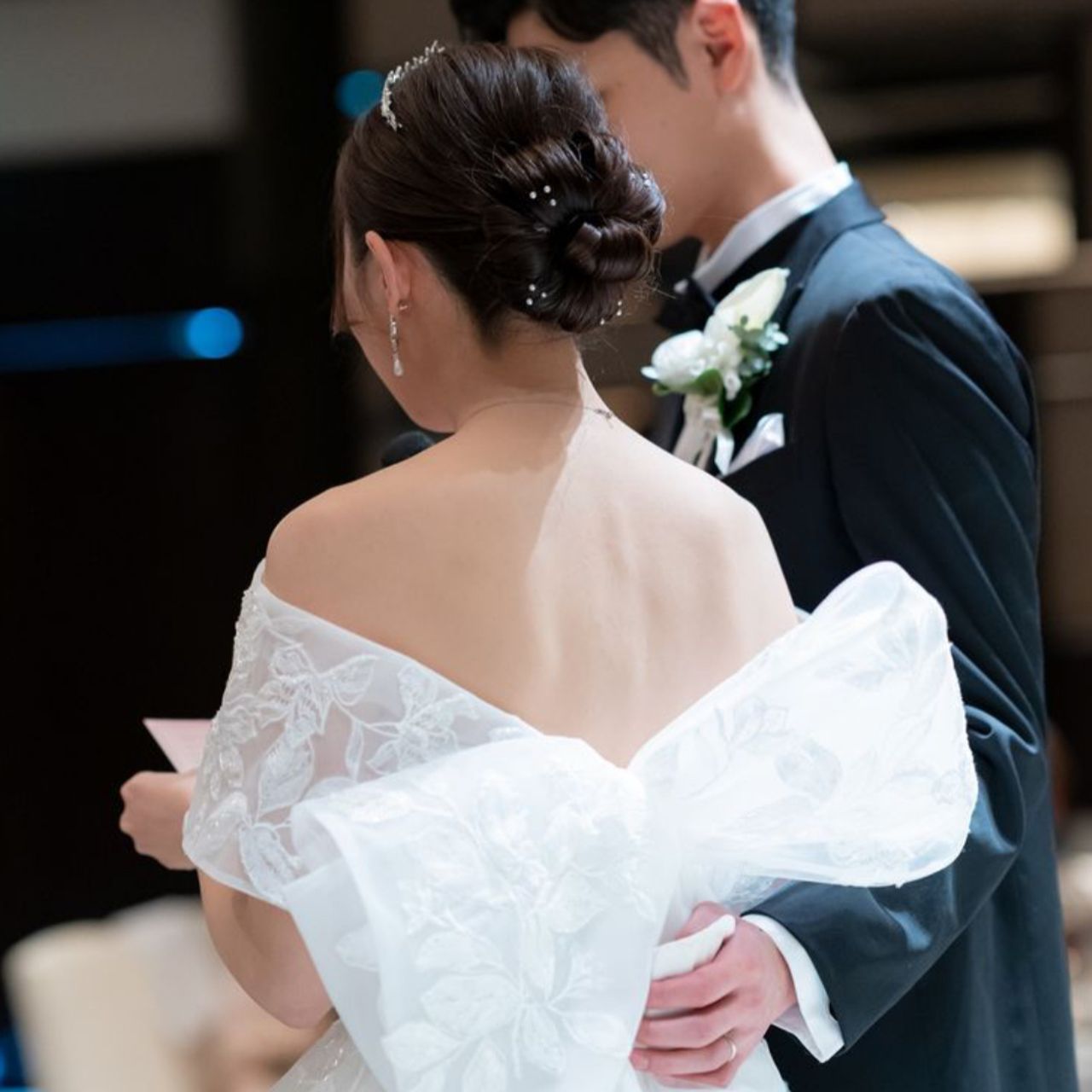 ドレスとセットで長いヴェールが付いており、後ろにあしらわれた大きなリボンがとても可愛らしく、そのデザインに心を惹かれました。袖は取り外しができる仕様になっているため、挙式と披露宴で雰囲気を変えられるところも魅力です。
