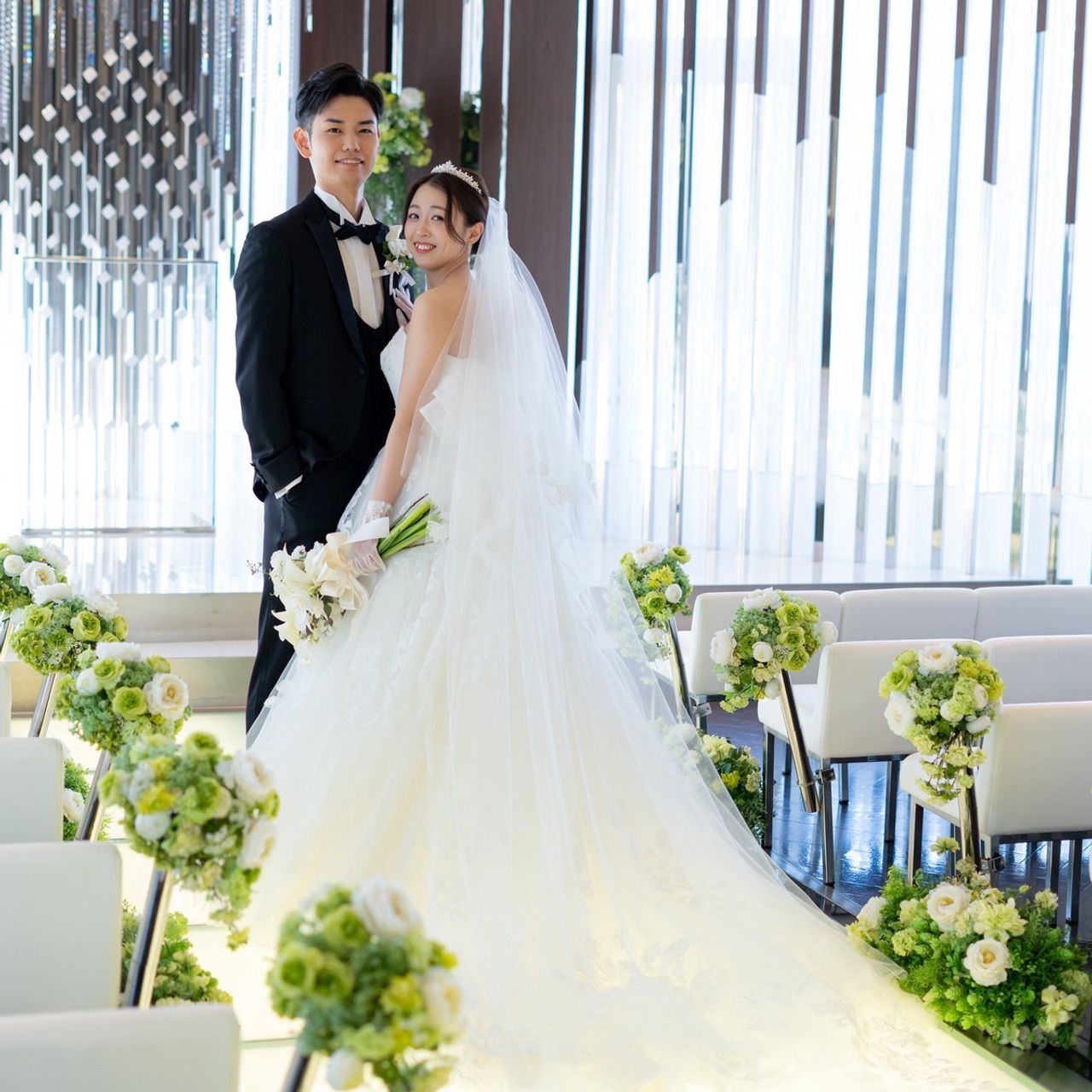 挙式はラグナヴェール名古屋にて、親族のみの温かな雰囲気の中で執り行いました。トレーンが長いドレスとヴェールを選んだのですが、ガラスのバージンロードがきらきらと輝き、その透明感に包まれて、ドレスの美しさがいっそう引き立って見えました。