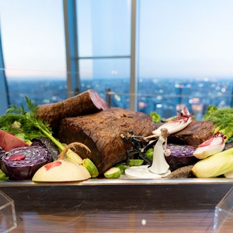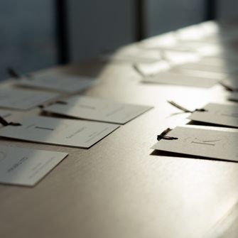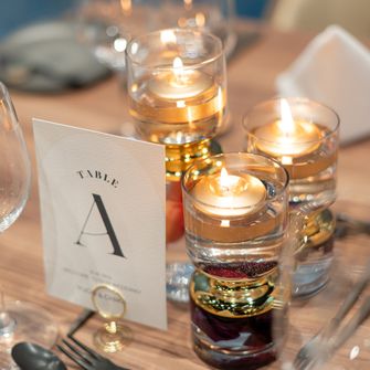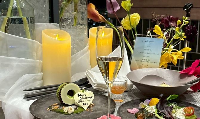 まず乾杯の際には、グラスの席札の色に意味を持たせました。青は「尊敬」、黄色は「感謝」、赤は「飲みすぎ注意」とし、遊び心のある演出でお酒とのつながりを表現しています。