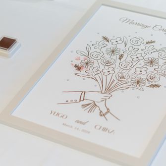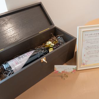 結婚証明書はワインボックスセレモニーにし、私たちが出会った年のワインをボックスに収め、友人には結婚のアドバイスを紙に書いて一緒に入れてもらいました。