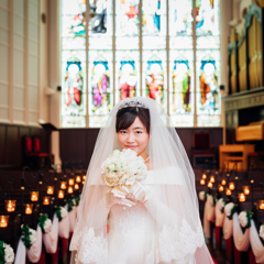 ステンドグラスの綺麗なチャペルで、トレーンの長いドレスを引きずって歩くレッドカーペットがお気に入りです!