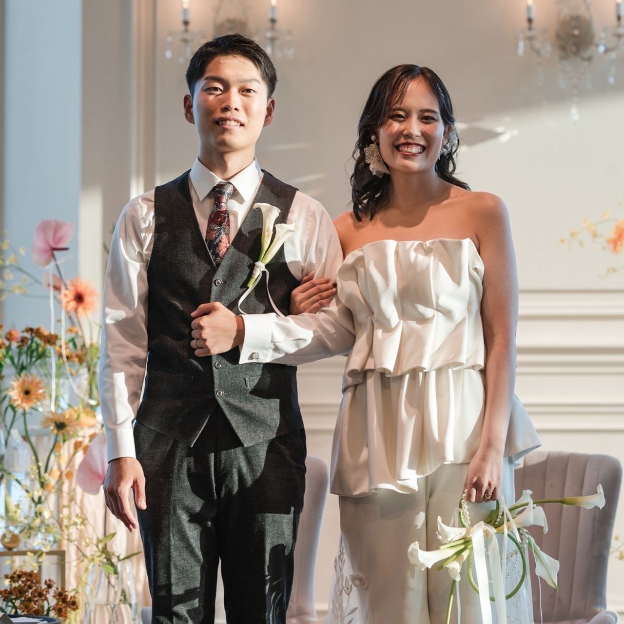 トップスは1着目と同じもので、ボトムスをパンツスタイルに変更しています。着た瞬間、私も担当の方もピンと感じて即決しました。憧れだったパンツドレスを着ることができて、とても幸せです。