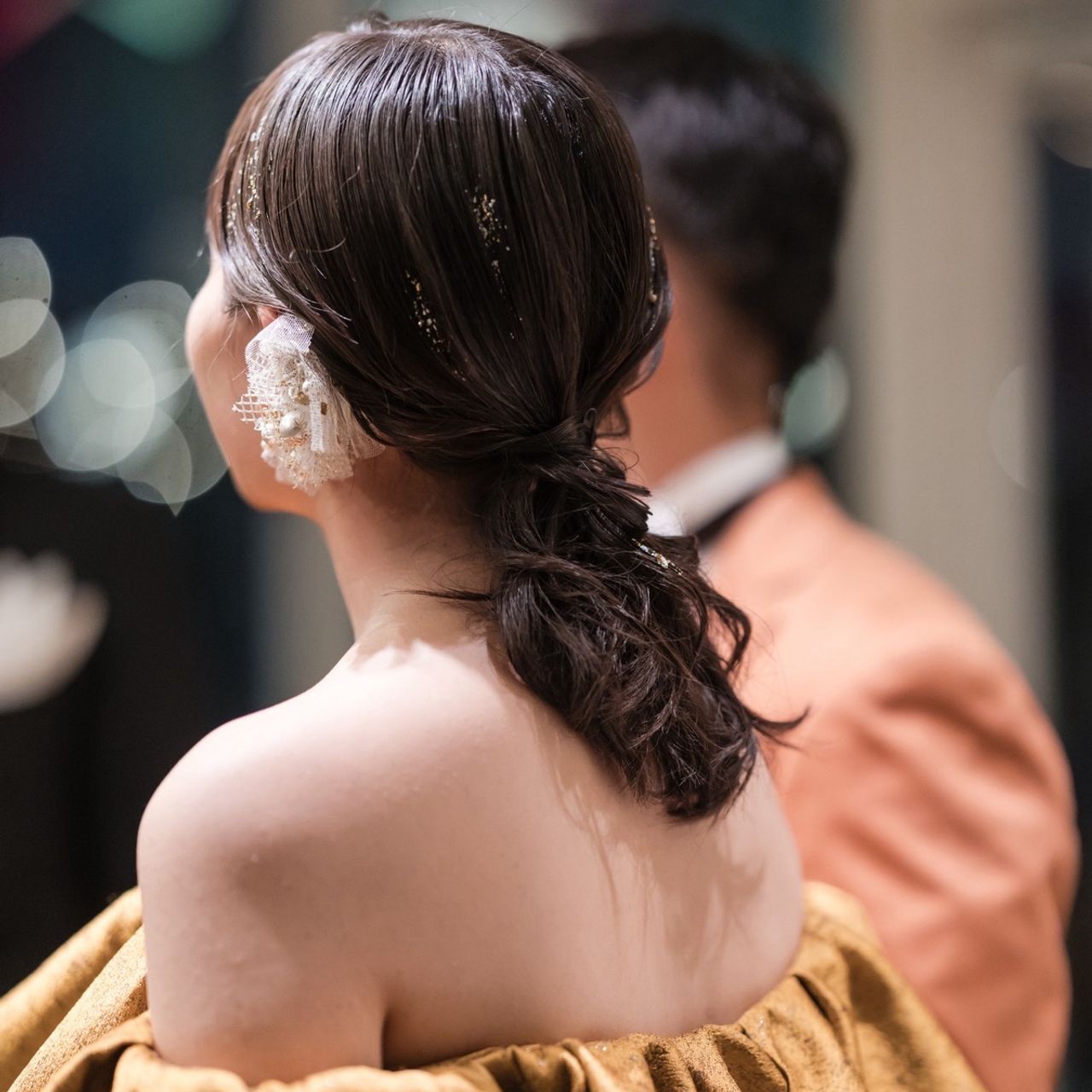 披露宴ではヘアアクセサリーは使わず、金箔や銀箔を取り入れています。金箔や銀箔を使ってみたかったので、とても嬉しかったです。