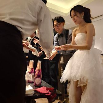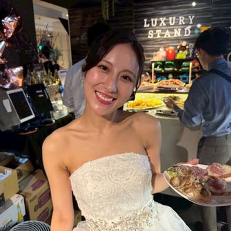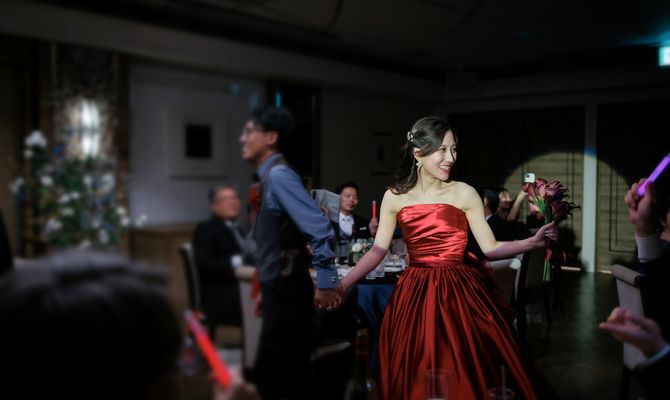 会場自体はラグジュアリーな雰囲気に仕上げたかったのですが、お酒好きのゲストが多かったので、みんなでお酒を楽しめる内容を考えて、お色直しのあと、2回目の乾杯「one more cheers」を行いました。