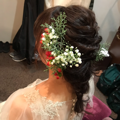 ヘアメイクはリハーサルがあったのでその際にイメージをお伝えしておきました。ナチュラルにゆるいアレンジが好きだったので、挙式、披露宴ともに後れ毛を出したアレンジをお願いしました。挙式はヴェールがあったので、あえてアクセサリーはなくしました。披露宴前半は挙式同様に編み込みを見せつつアップヘアに。前撮りでうまく活用できなかった、インスタでお譲りいただいたヘッドアクセを使いました。披露宴後半では編みおろしにして会場装花と合わせた生花をかざりました。ゲストからも好評でした!