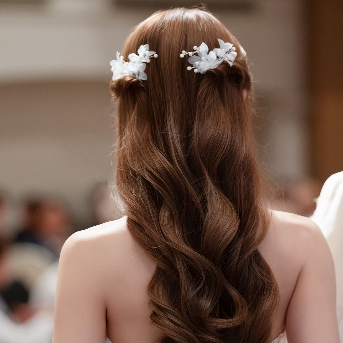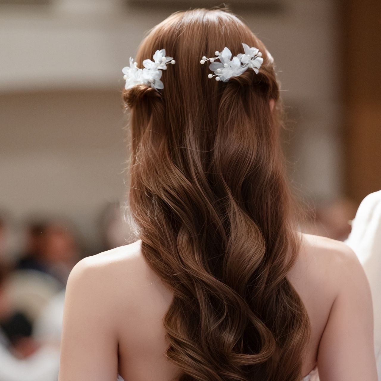 披露宴:ドレスに合わせて白いお花を両サイドにつけてもらいました。